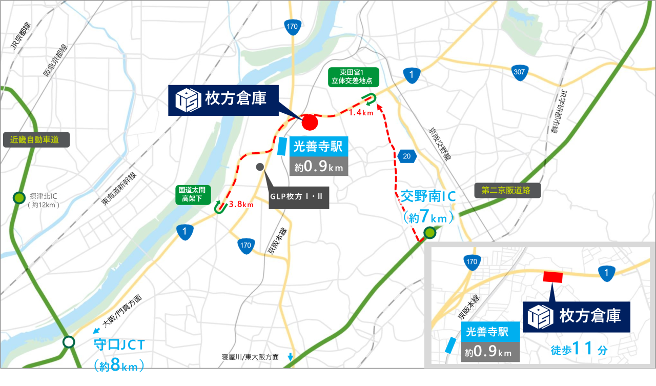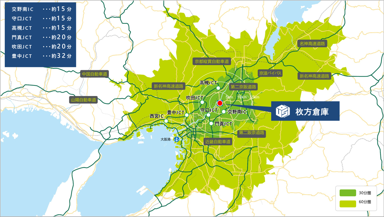 本枚方物流センターは、関西主要エリアへのアクセスに優れています。